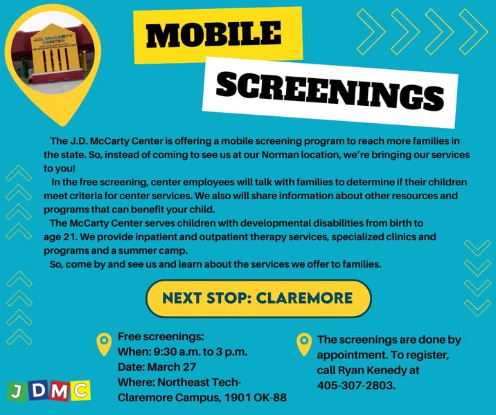 JD McCarty Center is offering mobile screenings on March 27 from 9:30 am to 3:00 pm at Northwest Tech - Claremore Campus. Screenings are done by appointment. To register, call Ryan Kennedy at 405-307-2803